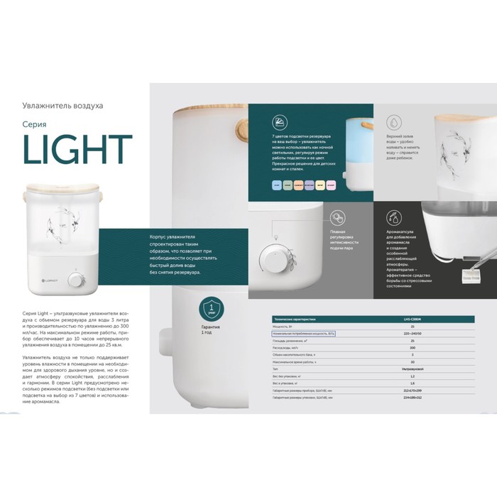 Увлажнитель Loriot LHS-C300M, ультразвуковой, 25 Вт, до 25 м2, 3 л, расход 300 мл/ч — Характеристики