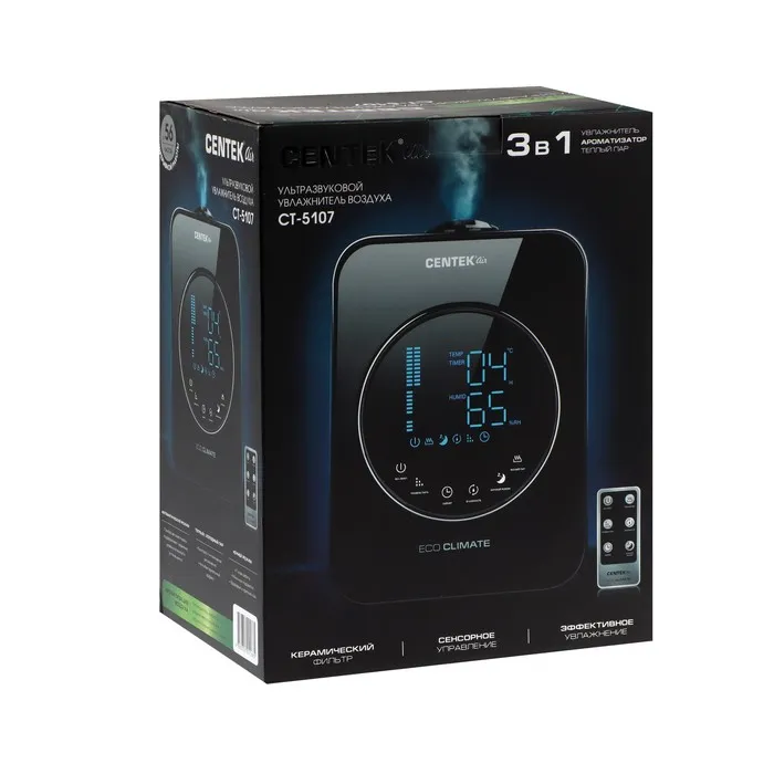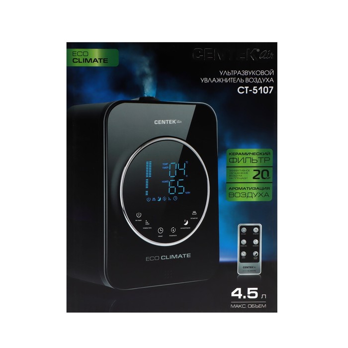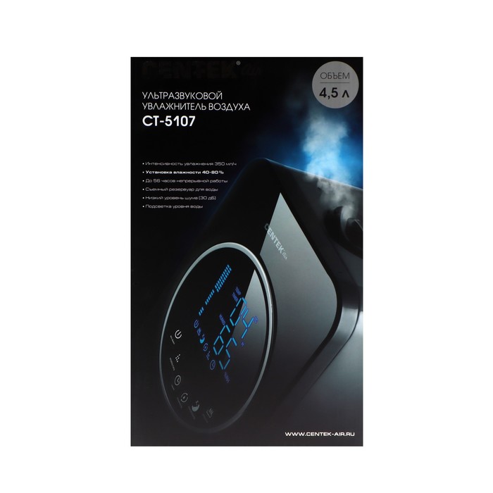 Увлажнитель воздуха CentekCT-5107, 40 Вт, 4.5 л, 20 м2, чёрный — Характеристики
