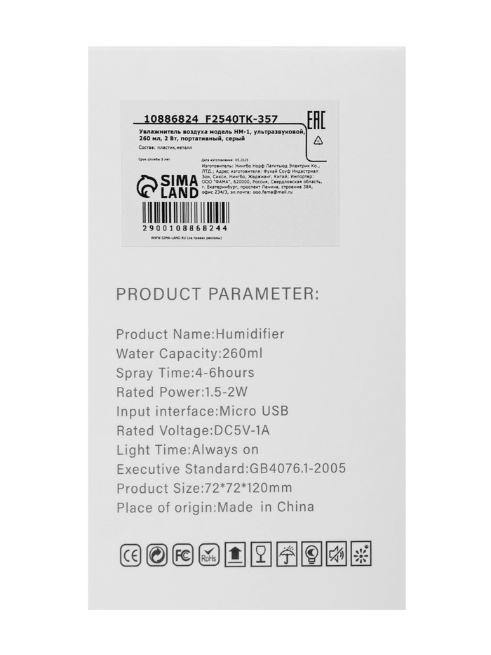 Увлажнитель воздуха Luazon HM-1, ультразвуковой, 260 мл, с подсветкой, 2 Вт, портативный, серый — Характеристики