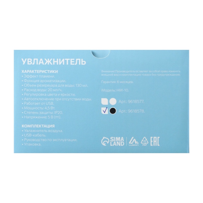 Увлажнитель воздуха Luazon HM-10, эффект пламени, 130 мл, 4.5 Вт, USB, чёрный — Характеристики