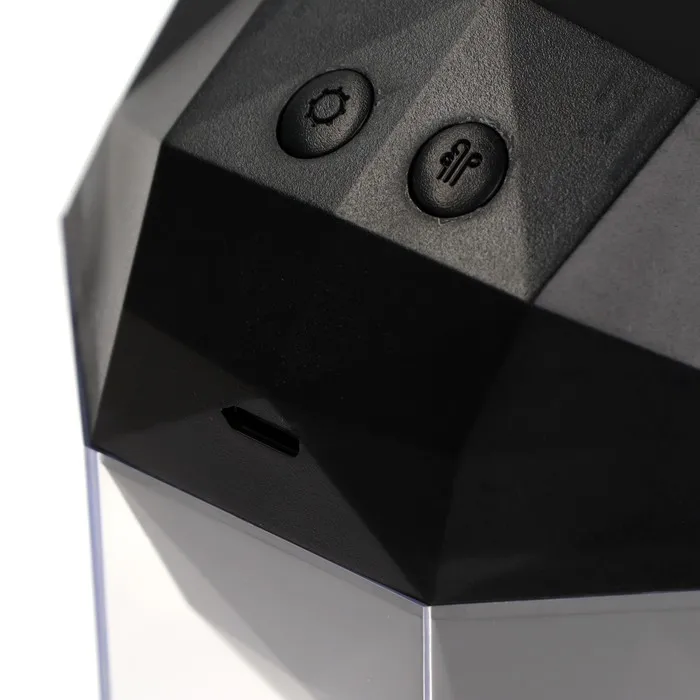 Простая панель управления регулирует несколько фкункций в увлажнителе: левая кнопка отвечает за подсветку (включает мультиподсветку или фиксирует определенный цвет), а правая кнопка позволяет выбрать между непрерывным и прерывистым распылением.