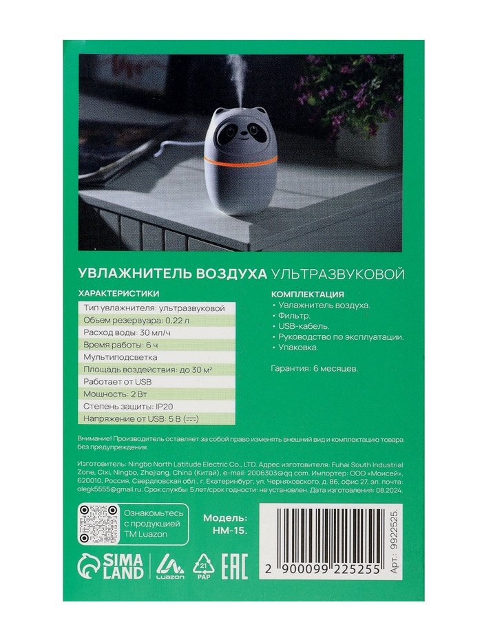 Портативный увлажнитель воздуха Luazon HM-15 «Панда» позаботится о вашем здоровье и комфорте. Устройство эффективно увлажняет воздух вокруг вас благодаря мощной струе пара. Компактный размер увлажнителя выгодно выделяет его среди остальных увлажнителей, позволяя пользоваться им дома, на работе, а также во время отдыха или занятий спортом.