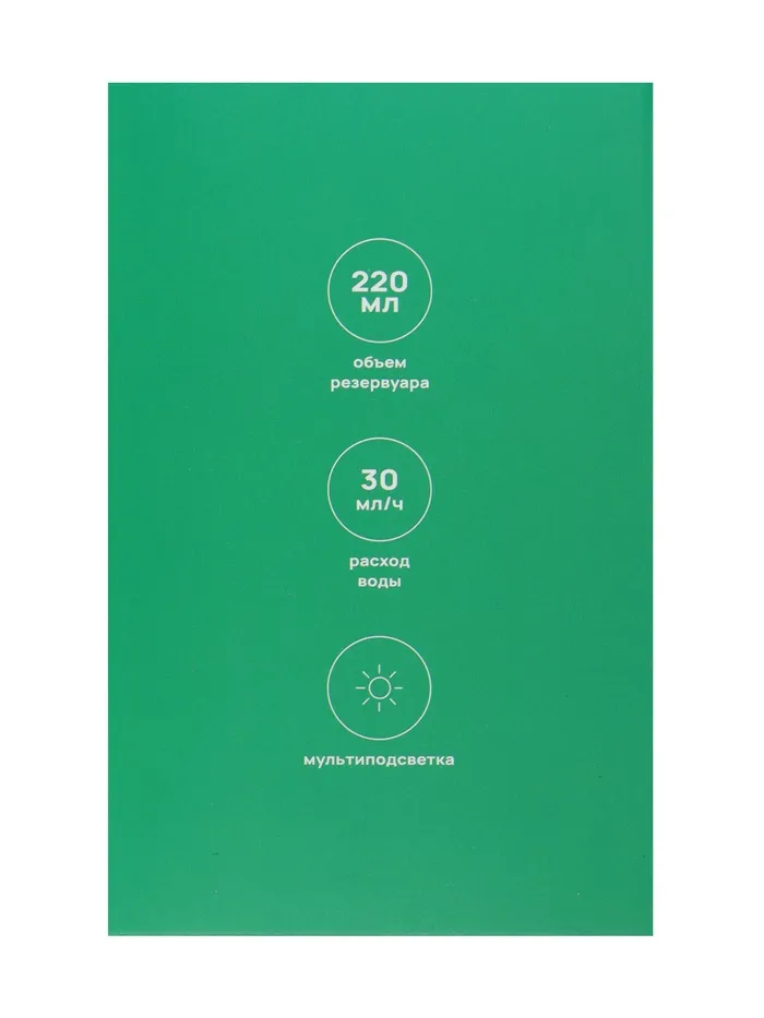 Бесшумная работа увлажнителя делает его эффективным и подходящим устройством для увлажнения воздуха во время отдыха или работы. Объёма резервуара в 220 мл хватит на продолжительную работу устройства. Управляйте увлажнителем с помощью одной кнопки: регулируйте интенсивность испарения и подсветку.