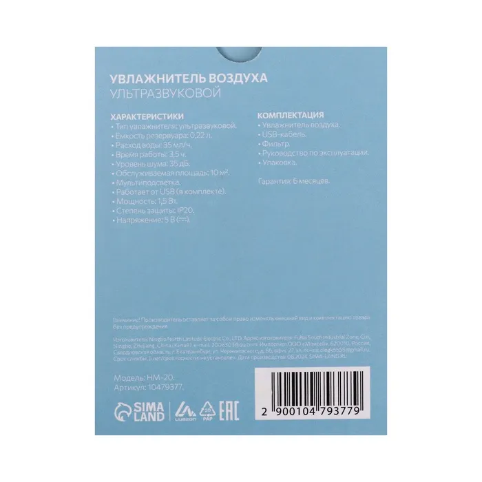 Ультразвуковой увлажнитель воздуха Luazon HM-20 — ваш надежный помощник в создании комфортного микроклимата в доме! Он прост и удобен в эксплуатации, поэтому им могут пользоваться даже маленькие дети. Увлажнитель обладает компктными размерами, что позволяет с комфортом брать его с собой в офис или на дачу, а работа от USB-кабеля даёт возможность использовать в качестве источника питания внешний аккумулятор или компьютер.