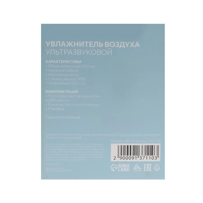 Увлажнитель воздуха Luazon HM-8, ультразвуковой, 300 мл, 4 режима, подсветка, USB — Характеристики
