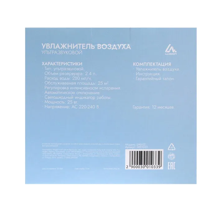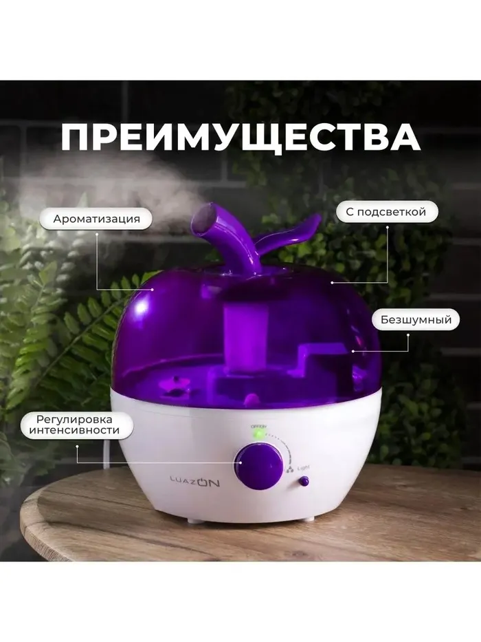 Увлажнитель воздуха Luazon LHU-02, ультразвуковой, 2.4 л, 25 Вт, бело-фиолетовый — Характеристики