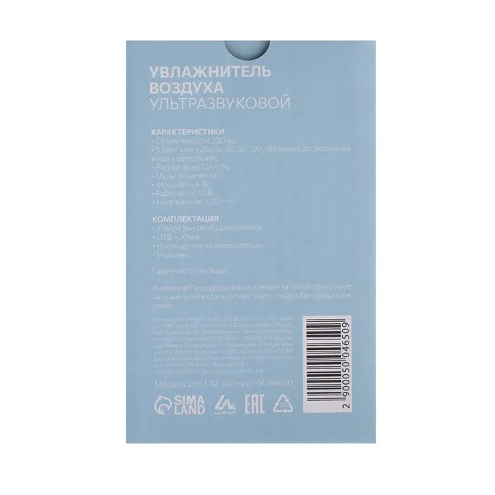 Увлажнитель воздуха Luazon LHU-12, ультразвуковой, 200 мл, 5 режимов, белый — Характеристики