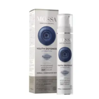 Сертифицированный, органический, увлажняющий дневной крем с антиоксидантами черники MOSSA оказывает тройное действие: