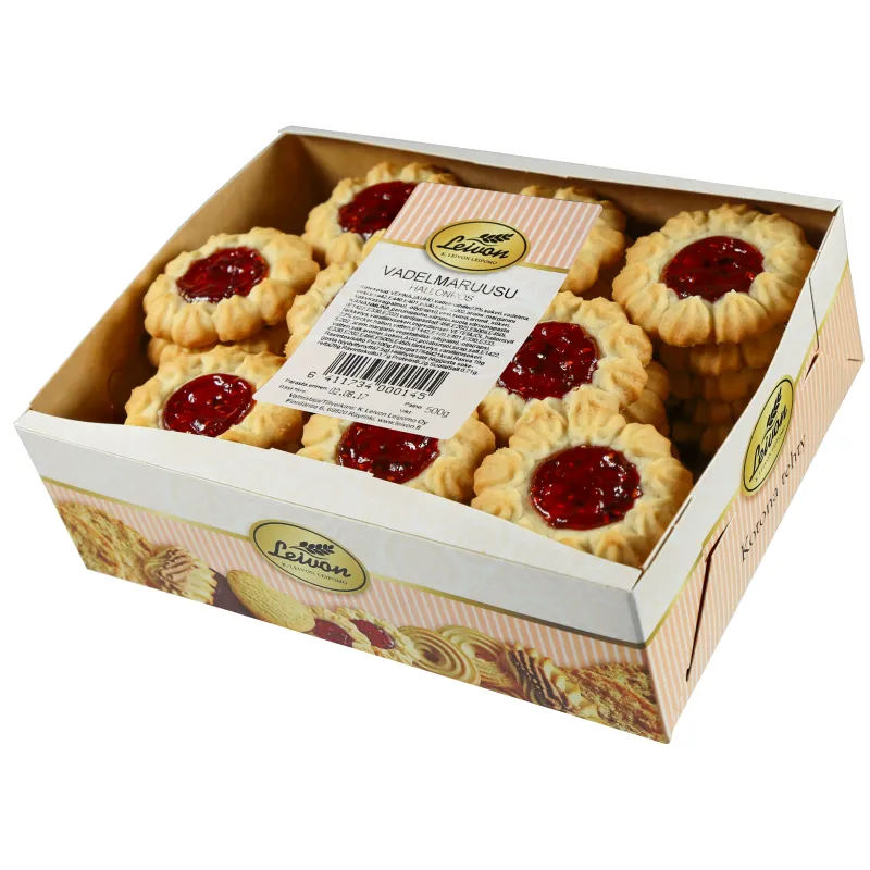 Малиновое печенье Leivon оживит ваш кофейный стол! Печенье с ароматом ванили и лимона наполнено свежим малиновым джемом. Без лактозы и молока. Упаковка 500 г. Информацию о продукте обновляем регулярно, однако рекомендуем всегда проверять данные на упаковке.