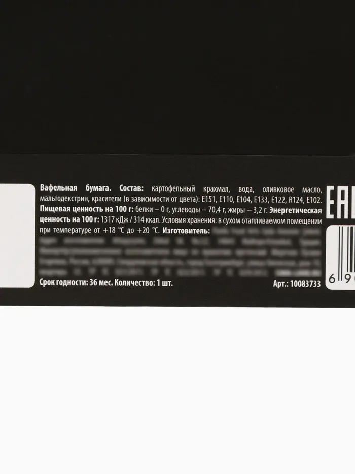 Состав: картофельный крахмал, вода, оливковое масло, мальтодекстрин, красители (в зависимости от цвета): Е151, Е110, Е104, Е133, Е122, R124, Е102.