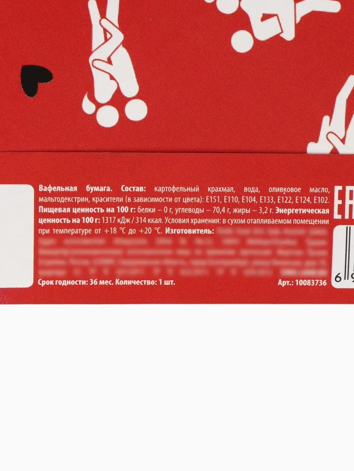 Состав: картофельный крахмал, вода, оливковое масло, мальтодекстрин, красители (в зависимости от цвета): Е151, Е110, Е104, Е133, Е122, R124, Е102.