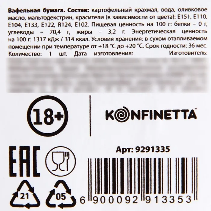 Состав: картофельный крахмал, вода, оливковое масло, мальтодекстрин, красители (в зависимости от цвета): E151, E110, E104, E133, E122, R124, E102.