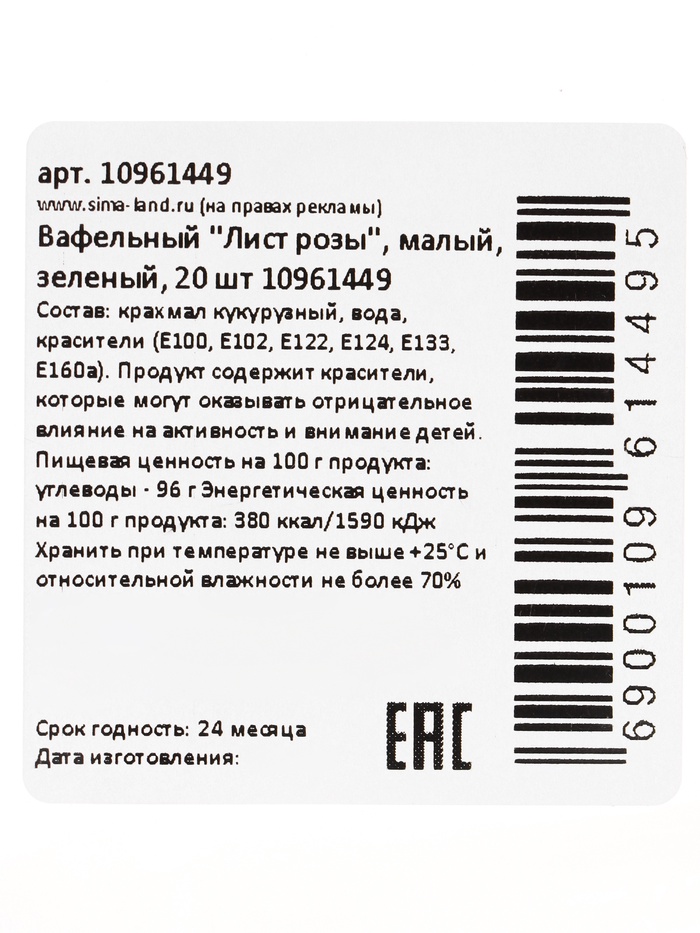 Вафельный «Лист розы», малый, зеленый, 20 шт. — Характеристики