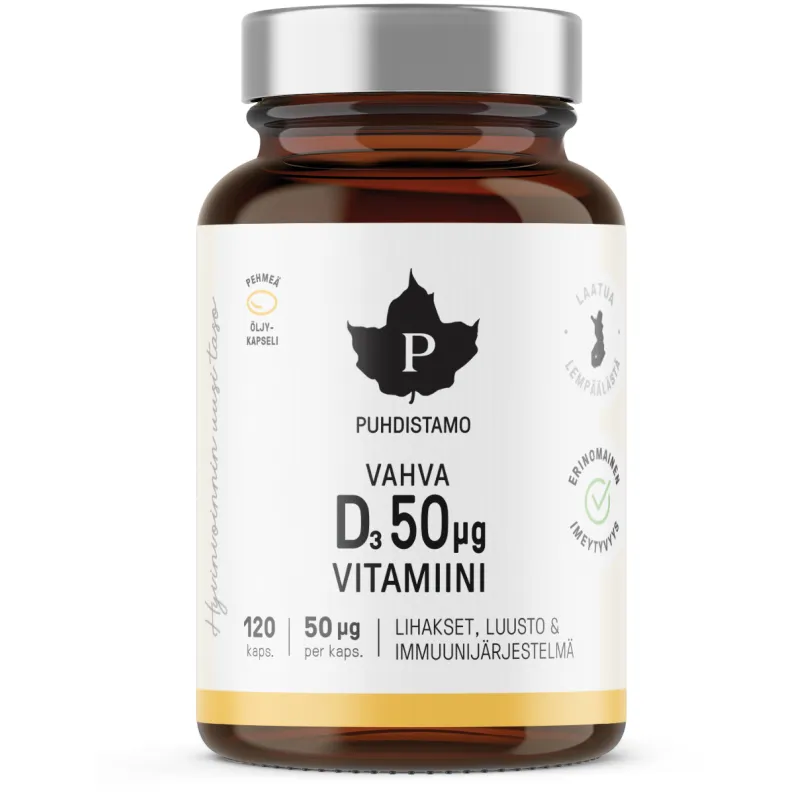 Упаковка содержит 120 капсул. Витамин D от Puhdistamo поможет вам поддерживать здоровье костей и иммунной системы. Обновляем информацию о продукте постоянно. Рекомендуем всегда проверять данные на упаковке.