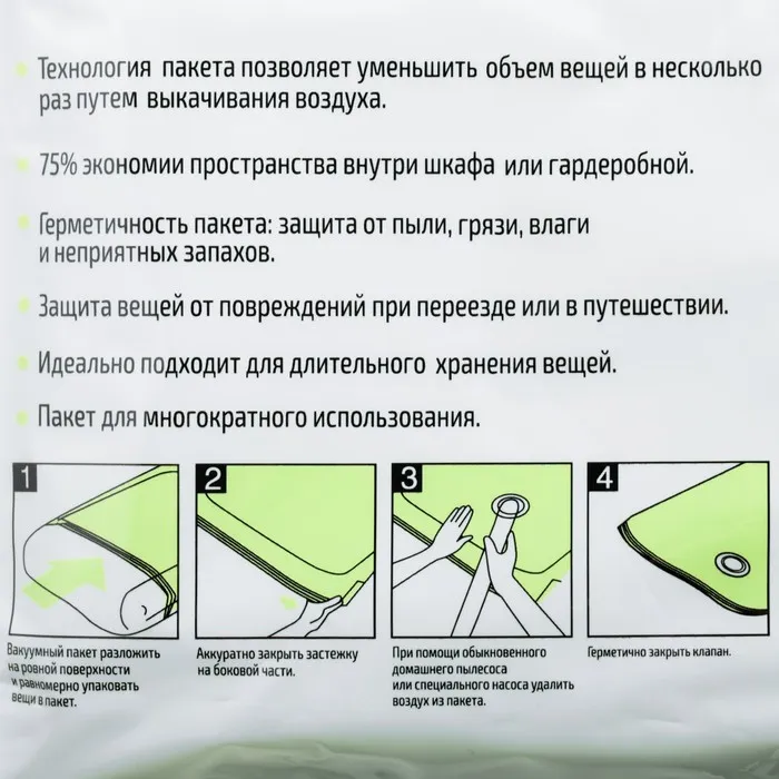 Объём хранимых вещей уменьшается в 4 раза! Вы значительно экономите драгоценное пространство, а также время на упаковку.