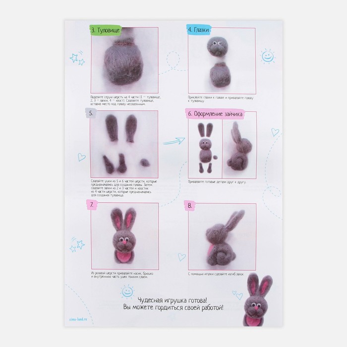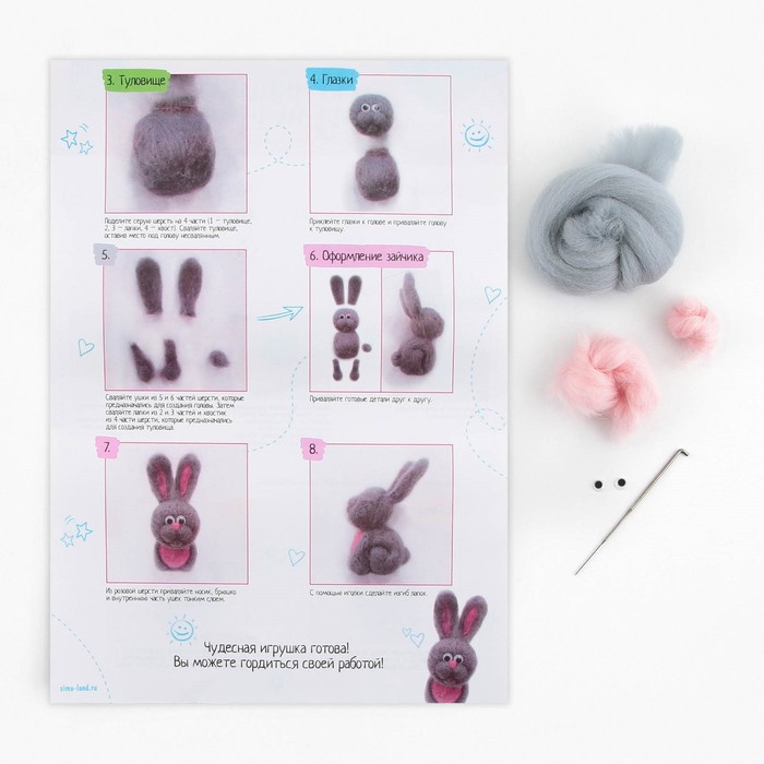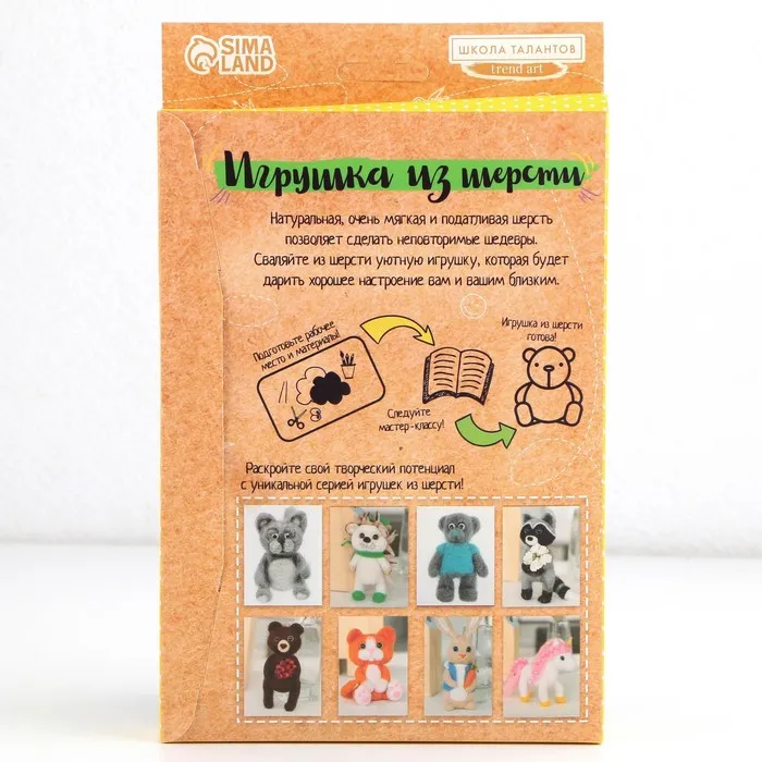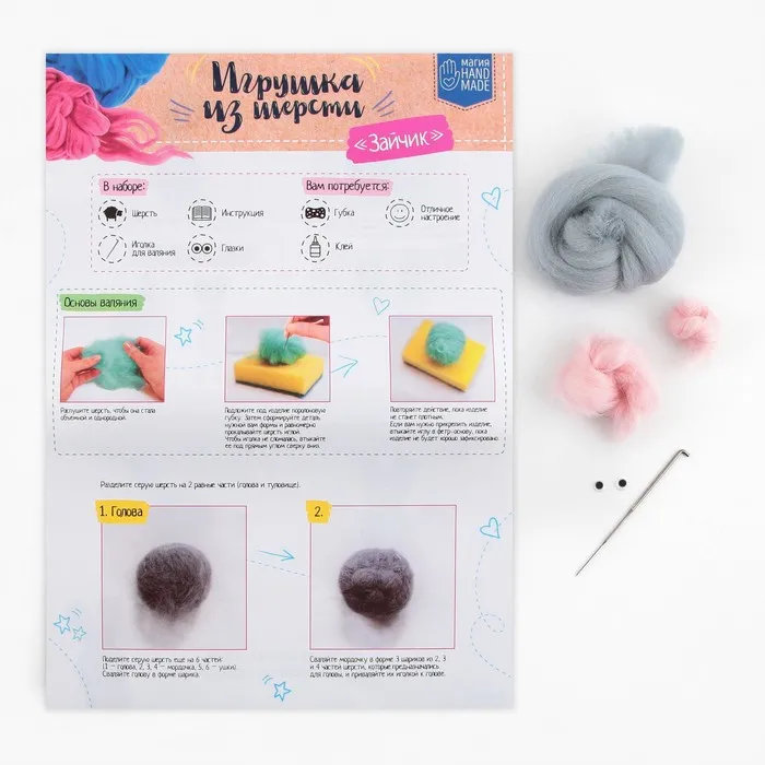 В этом наборе собрано всё самое необходимое для создания своими руками игрушки в технике сухого валяния. Раньше, чтобы смастерить что-то подобное, приходилось искать шерсть разных цветов в магазине, у бабушки, в маминых коробочках с пряжей, а сейчас всё необходимое есть в комплекте для творчества. Теперь даже начинающий любитель фелтинга быстро создаст красивую игрушку.