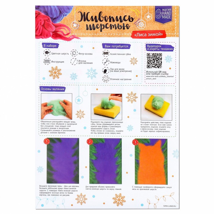 Данный вид творчества основан на валянии. Никогда не слышали о такой технике? Это не проблема: создать мягкое и пушистое панно вам помогут подробные инструкции и видео-мастер-класс, входящие в набор.