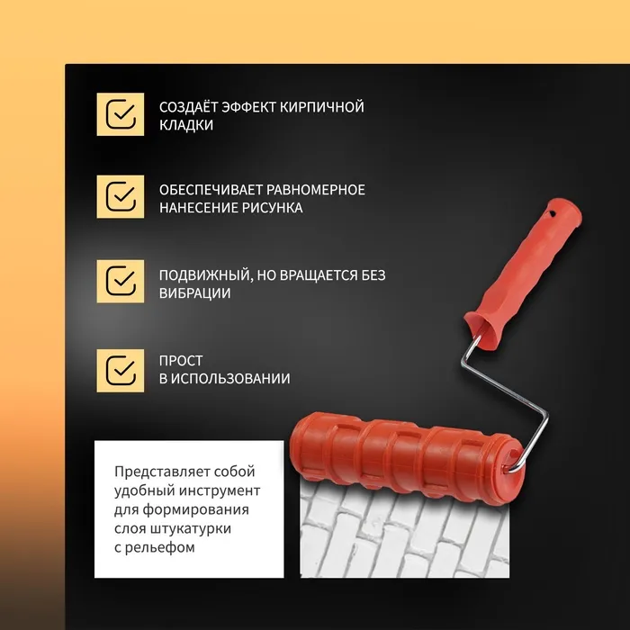 Создайте эффект кирпичной кладки за минуты! Резиновый валик «Кирпич» 180 мм — профессиональный инструмент для декоративной отделки. Формирует реалистичную текстуру кирпичной стены на штукатурке и структурных красках.