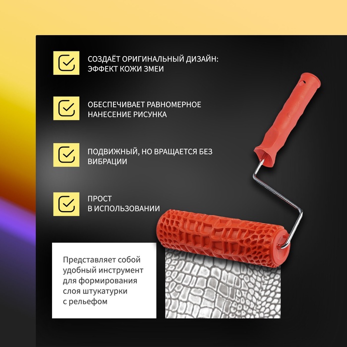 Как использовать: Наносите на предварительно подготовленную поверхность структурные составы, затем прокатывайте валиком для создания рельефа. Подходит для декоративной штукатурки, фактурных красок, жидких обоев. После работы сразу очищайте резиновую поверхность от остатков материала.