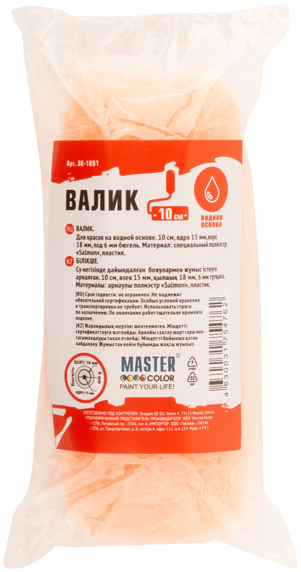 Валик изготовлен из специального полиэстера с ворсом длиной 18 мм, что делает его пригодным для работы с различными видами красок. Шубка крепится методом термосинтеза, что обеспечивает надежность и долговечность использования. Валик легко монтируется на ручку диаметром 6 мм.