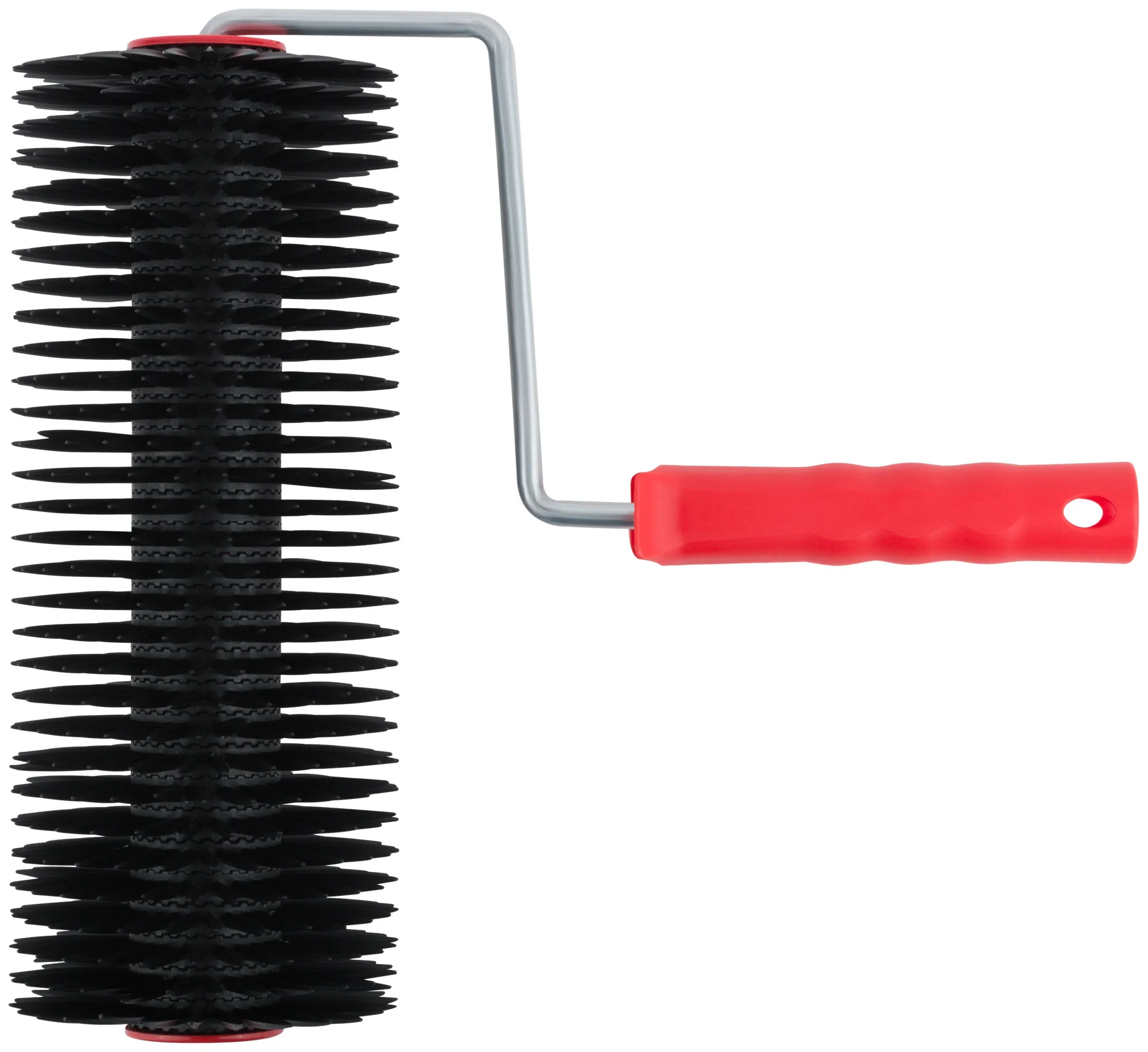 Валик оснащен иглами высотой 28 мм и диаметром 116 мм, что делает его идеальным выбором для работы с различными типами наливных полов. Пластиковая конструкция обеспечивает легкость и долговечность инструмента, а его ширина 300 мм позволяет быстро обрабатывать большие площади.