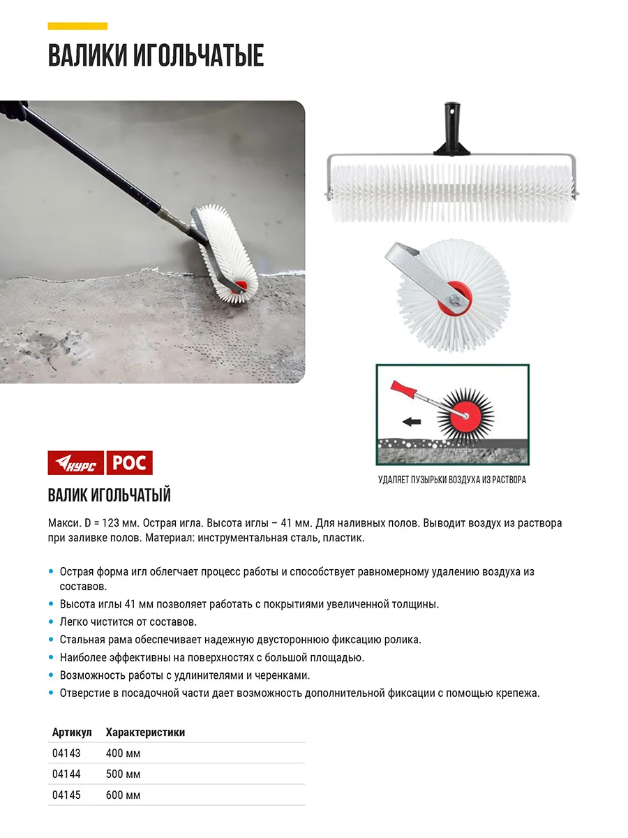 Игольчатый валик Макси диаметром 123 мм и высотой иглы 41 мм незаменим при заливке наливных полов. Он эффективно выводит воздух из раствора, предотвращая образование пузырей и обеспечивая равномерное распределение материала. Это делает его идеальным выбором для мастеров, стремящихся к качественной и быстрой работе.