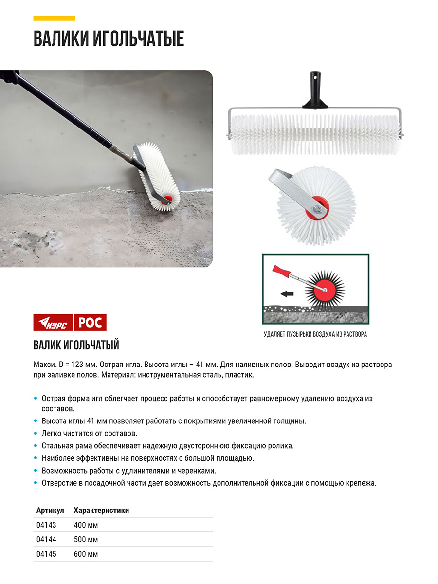 Позволяет эффективно удалять воздух из наливных полов, предотвращая образование пузырей и обеспечивая идеально ровную поверхность. Применение в строительстве и ремонте позволяет ускорить процесс заливки и улучшить качество покрытия.