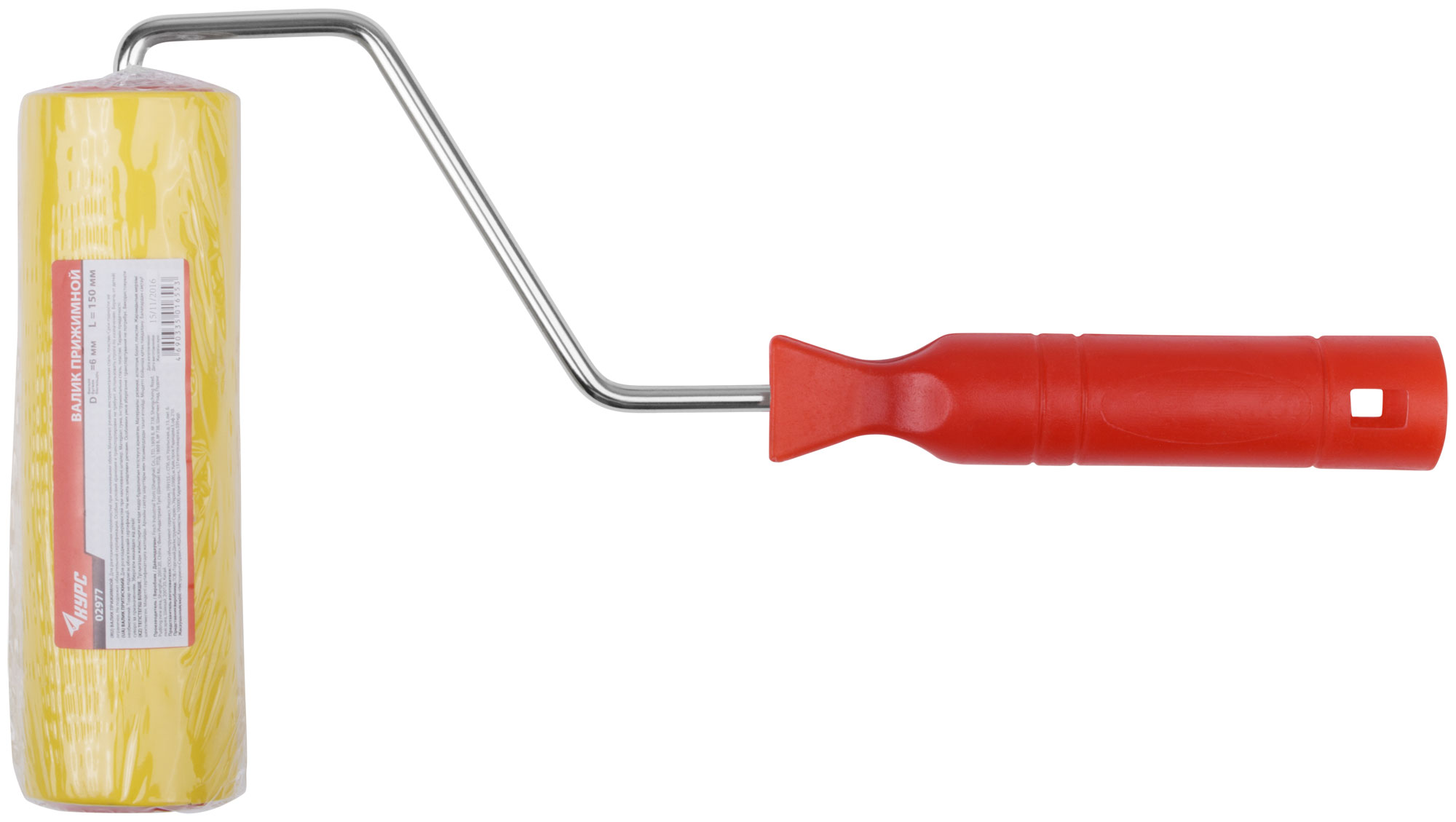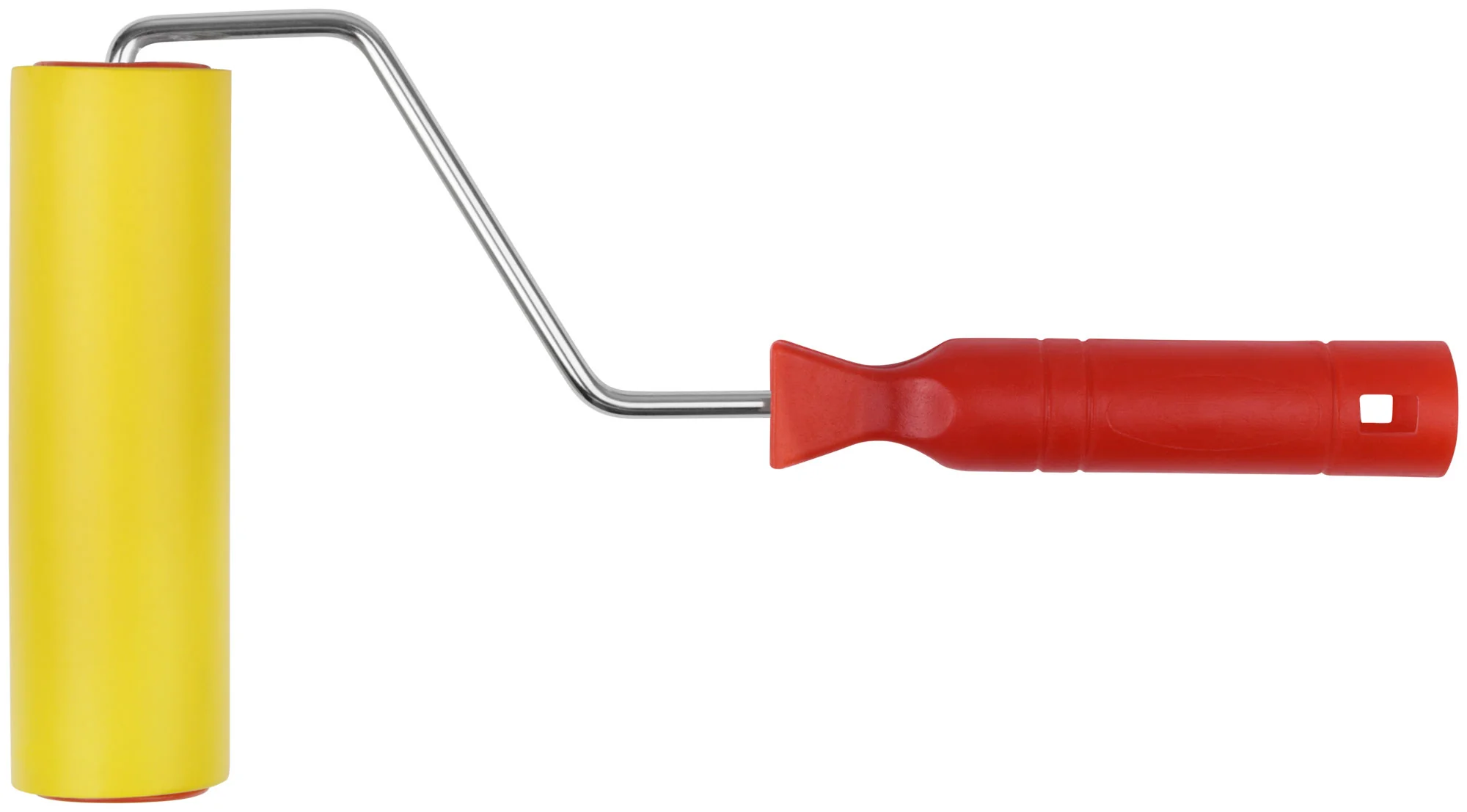 Валик оснащен гладкой резиновой поверхностью, которая обеспечивает равномерное давление на обои. Размер валика составляет 150 мм, что делает его удобным для работы на больших участках. Бюгель диаметром 6 мм обеспечивает надежное крепление и удобство использования.