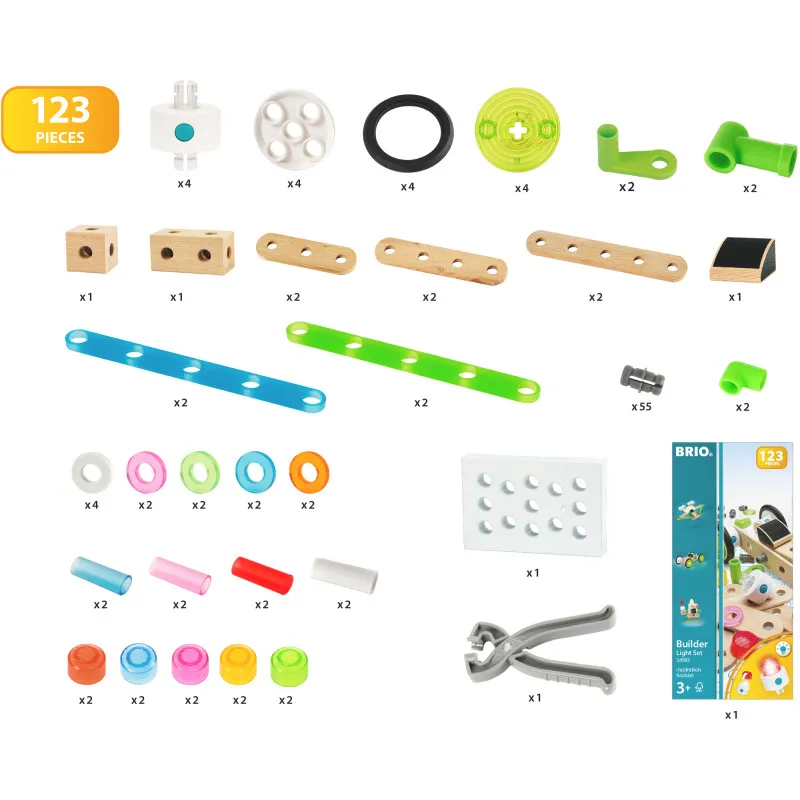Набор Brio Builder 34593 освещает ваши конструкции! Этот набор для маленьких строителей содержит 120 деталей, работающие от батареек осветительные элементы и простые в использовании инструменты для создания воображаемых построек. Осветительные элементы имеют четыре режима работы: включено, выключено, мигание и пульсация. Они совместимы с прозрачными пластиковыми деталями. Батарейки входят в комплект.