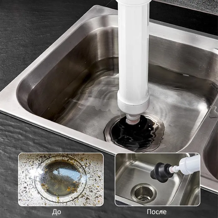 Гидропробивка труб работает за счёт сжатого воздуха. За счёт мощного потока он легко проталкивает волосы и грязь по трубе, и засор исчезает.