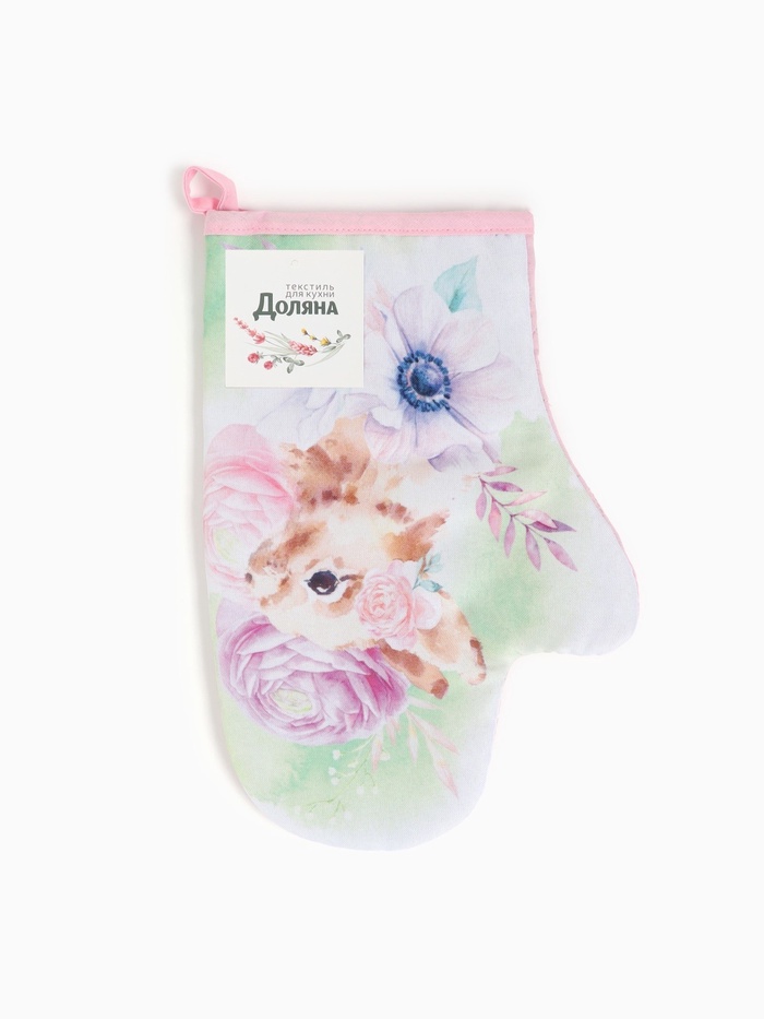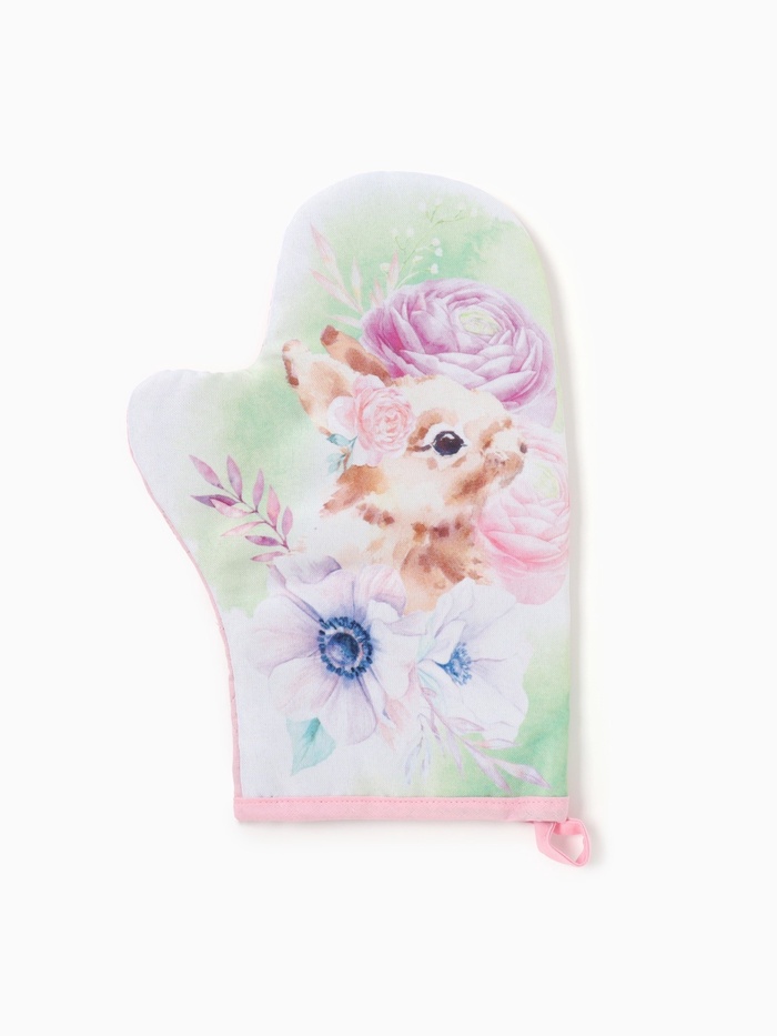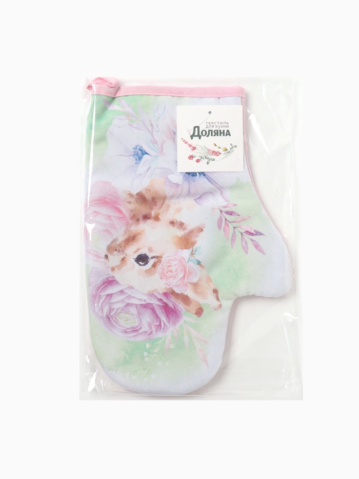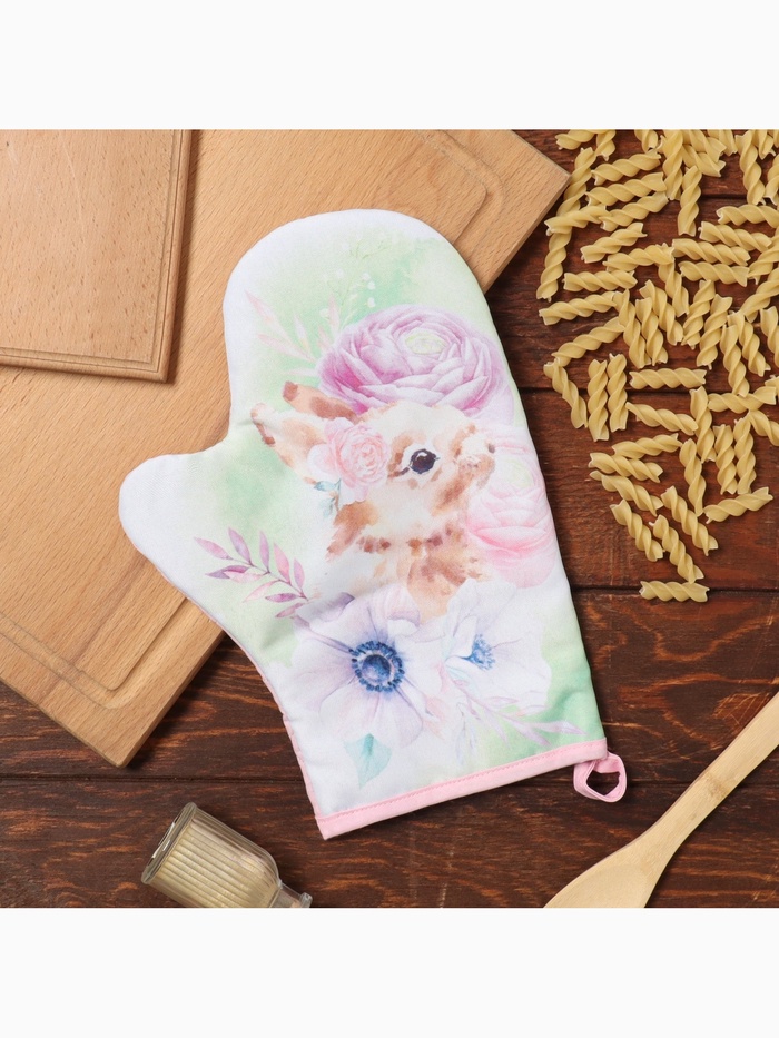 Эта фигурная прихватка-варежка с милым зайчиком станет верным помощником на кухне и тёплым подарком к 8 Марта. Плотный хлопковый габардин с ватиновой прослойкой надёжно защитит ваши руки от горячей посуды и сковородок. Нежный цветочный рисунок создаёт весеннее настроение каждый день.
