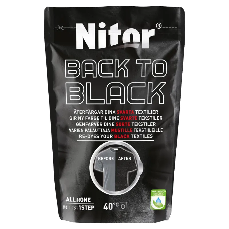 Nitor Back to Black – это средство для восстановления интенсивного черного цвета ваших вещей! Легко верните великолепный цвет выцветшим тканям. Ткань окрашивается в стиральной машине при температуре 40 градусов вместе со средством для восстановления цвета, никаких других веществ не требуется.