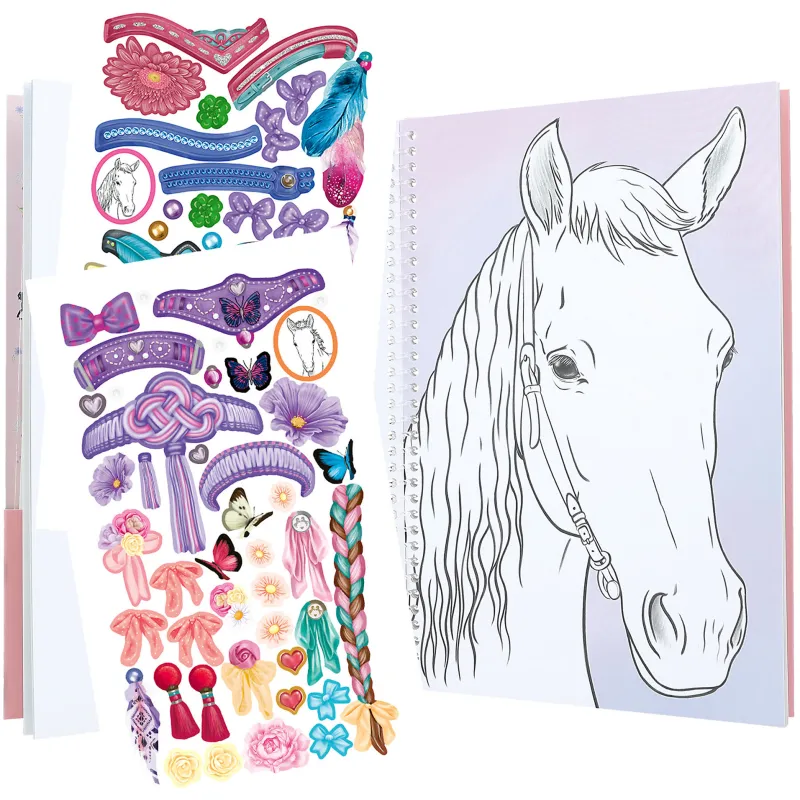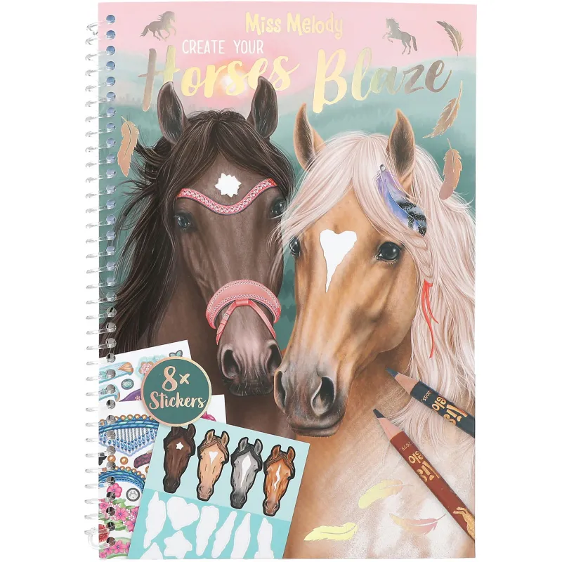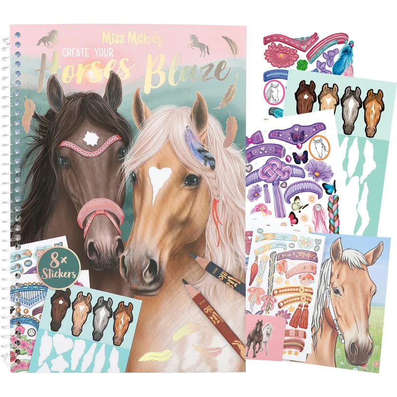 Книга для раскрашивания и наклеек Miss Melody с пружинным переплетом подарит часы увлекательного времяпрепровождения. Раскрашивайте изображения лошадей на 36 страницах и украшайте свои работы прилагаемыми наклейками. В комплекте 8 листов с наклейками.