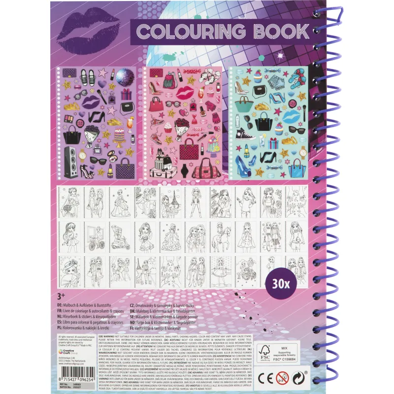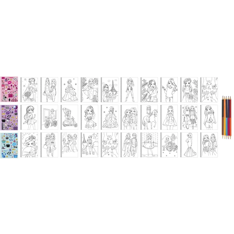 Раскраска Besties предлагает множество страниц для творчества. В комплект входят наклейки и пять двусторонних цветных карандашей.