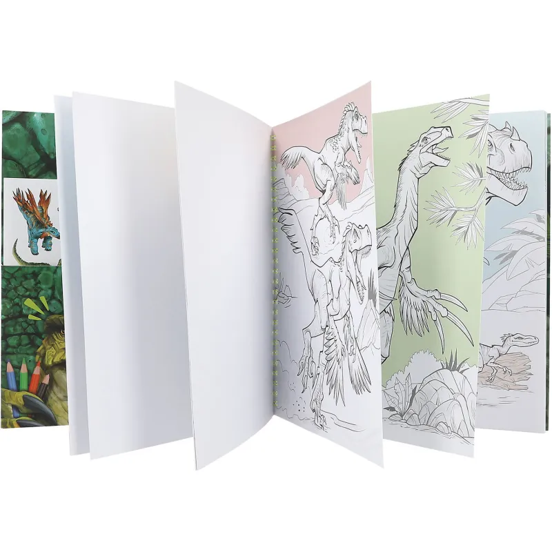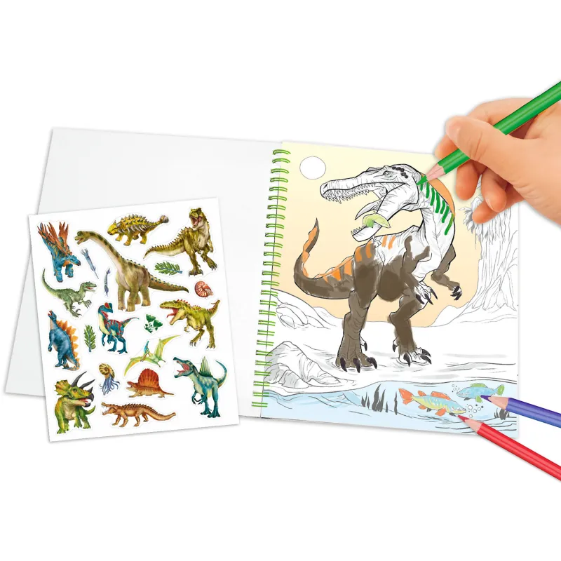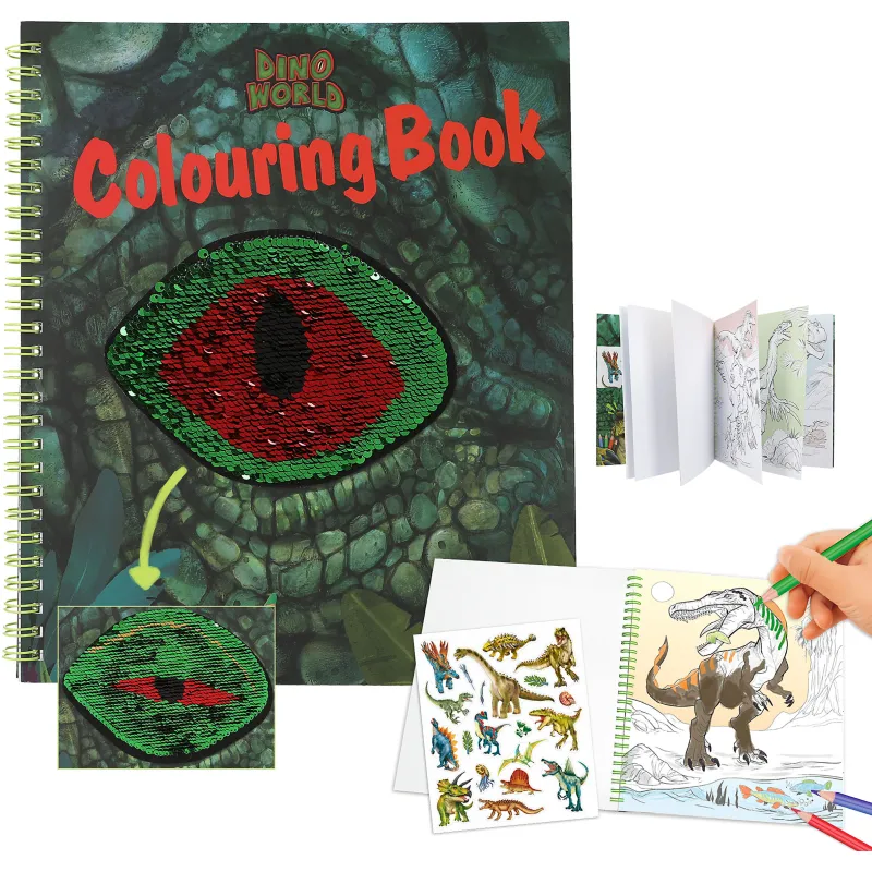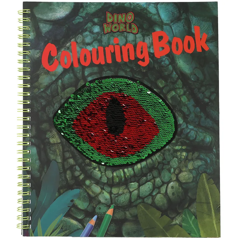 Украсьте страницы раскраски Dino World яркими цветами и завершите свой шедевр с помощью прилагаемых наклеек! Уникальная обложка с пайетками, которые открывают или закрывают глаза динозавра при проведении по ним, придаёт книге особое очарование. Внутри вы найдёте 20 раскрасок с различными динозаврами.