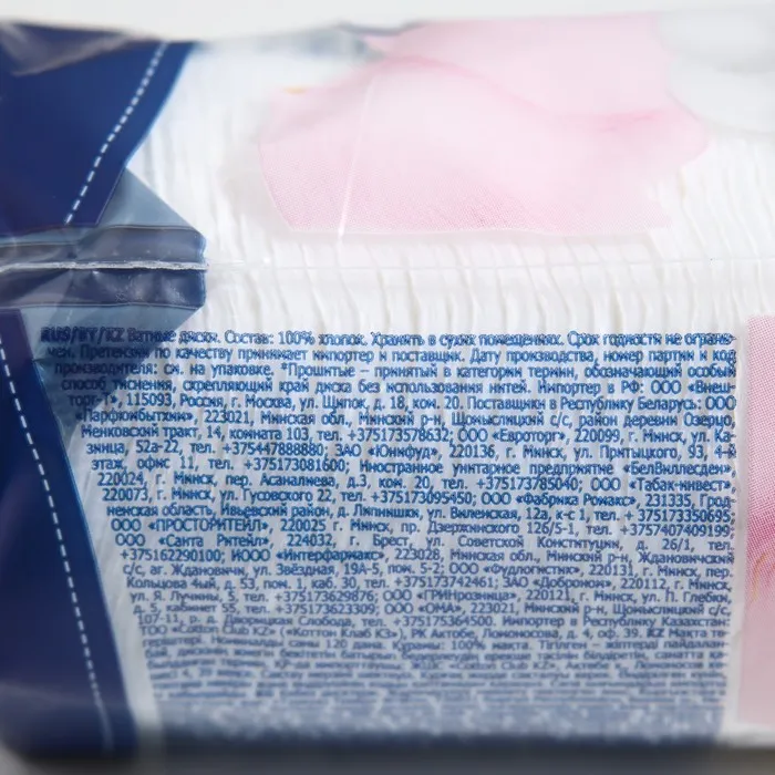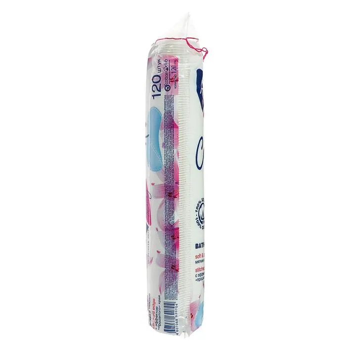 В упаковке содержится 120 ватных дисков, упакованных в полиэтиленовый пакет. Это позволяет долго сохранять свежесть и качество продукта.