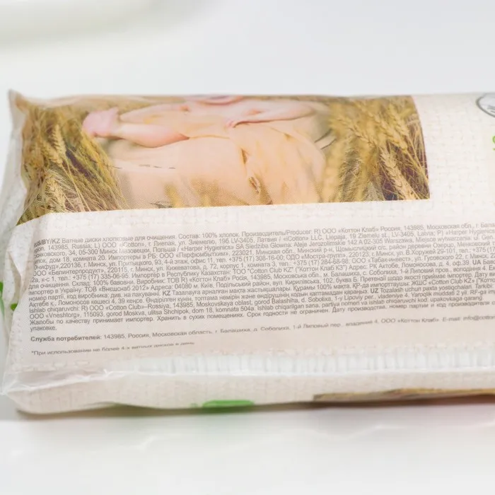 Описание: ватные диски произведены из 100% натурального хлопка. Прошитый край обеспечивает надежность в использовании без расслоения диска и ворсинок после применения.
