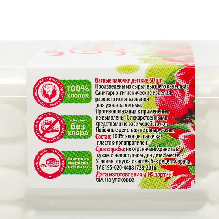 Описание: ватные палочки произведены из 100% натурального хлопка. Специальная форма головки в виде пики создана для быстрого и аккуратного нанесения или корректировки макияжа. Ватные палочки не расслаиваются и не оставляют ворсинок после применения. Ватная головка надежно крепится на прочном стике, который не ломается и не гнется при использовании.