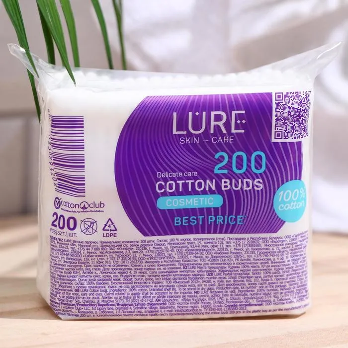 Ватные палочки LURE изготовлены из 100 % чистого хлопка – мягкого природного материала, обладающего абсорбирующими свойствами. Ватная головка надёжно крепится к держателю, она не расслаивается и имеет хорошее сцепление с палочкой. Ватные палочки моментально впитывают влагу и не оставляют мелких ворсинок. Эластичные пластиковые палочки обеспечивают максимальное удобство использования.