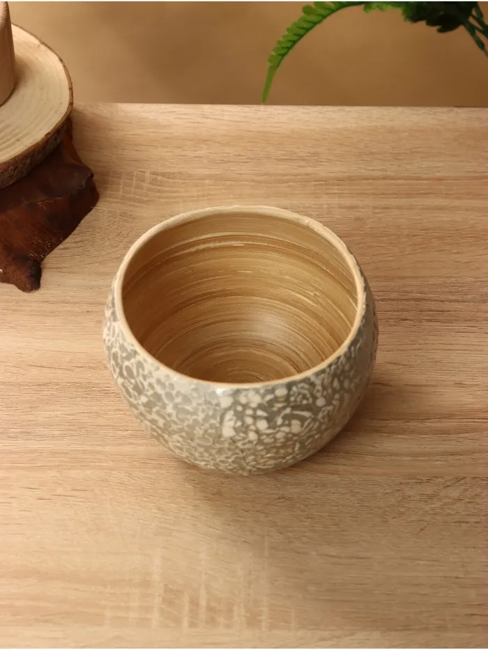 Элегантная ваза из бамбука с узором, выполненная в серебристо-белых тонах. Её изысканная текстура и ручная работа делают эту вазу настоящим произведением искусства. Идеально подходит для декорирования интерьера и хранения горячих цветов благодаря устойчивости бамбука к высоким температурам. Диаметр вазы - 15 см, высота - 9 см - универсальный размер для любого интерьера.