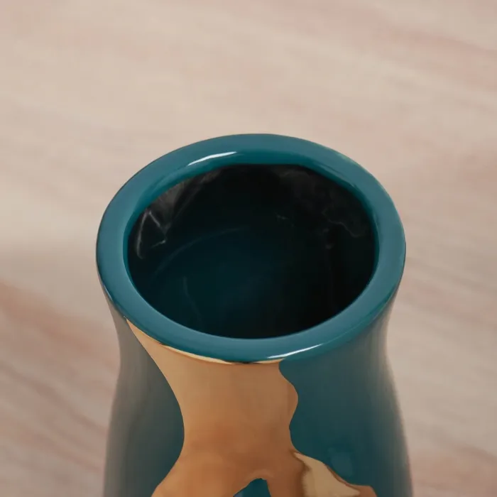 Элегантная настольная ваза высотой 18 см с декором золотистого оттенка. Ее зеленый цвет привнесет свежие и природные акценты в любой интерьер. Стильный акцент для вашего дома или офиса.