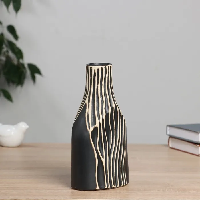 Настольная ваза станет стильным акцентом в вашем интерьере. Её глубокий черный цвет и уникальное оформление придают ей современный вид, который легко вписывается в любые дизайнерские решения. Эта ваза не просто сосуд для цветов — она добавляет характер и индивидуальность вашему пространству.