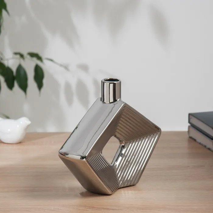 Настольная ваза из керамики с эффектным серебристым покрытием, высотой 20 см. Декор в виде абстрактных узоров в форме ромбов делает её уникальной деталью вашего интерьера. Эта ваза станет ярким акцентом в любом пространстве, подчеркивая ваш утонченный вкус.
