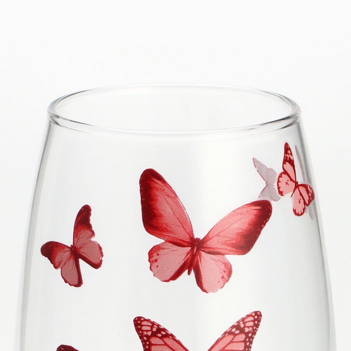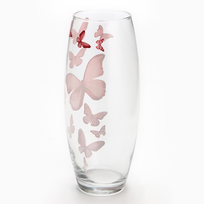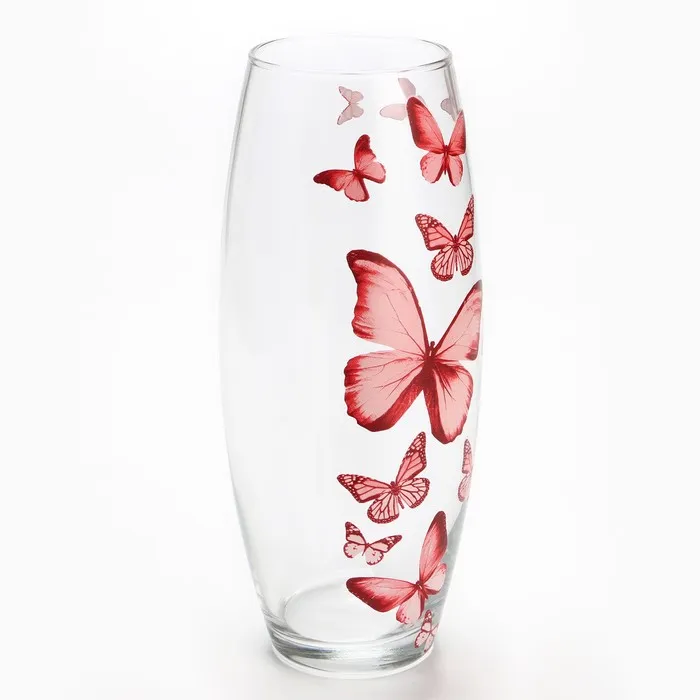 Изготовлена из прозрачного стекла, украшена деколем с изображением бабочек. Ваза имеет высоту 26 см, объем 1,7 литра.