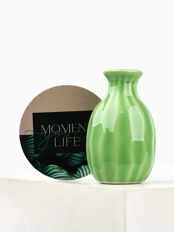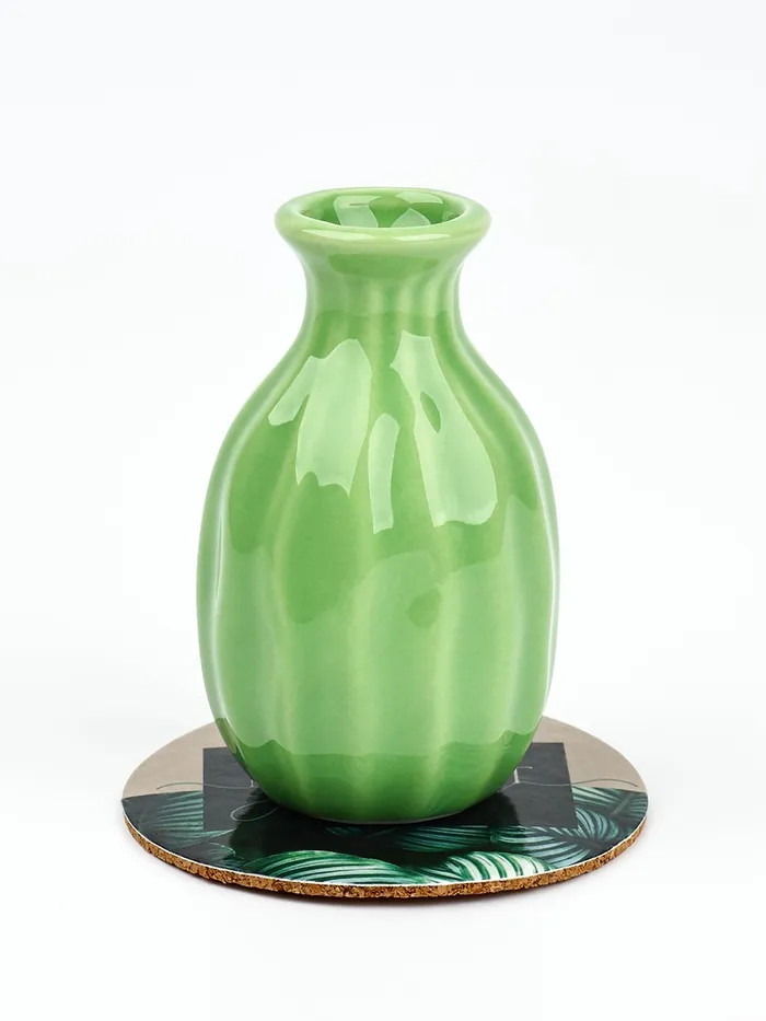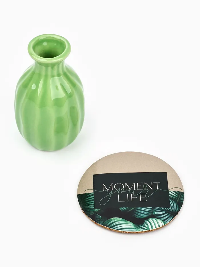 Декоративная ваза отлично дополнит любой букет или флористическую композицию. Так же, миниатюрная ваза, выполненная из керамики будет актуальна как самостоятельный предмет интерьера. В комплекте идет пробковая подставка с красивым рисунком, который отлично сочетается с самой вазой. Ваза-мини с подставкой - прекрасный подарок человеку со вкусом на любой праздник.