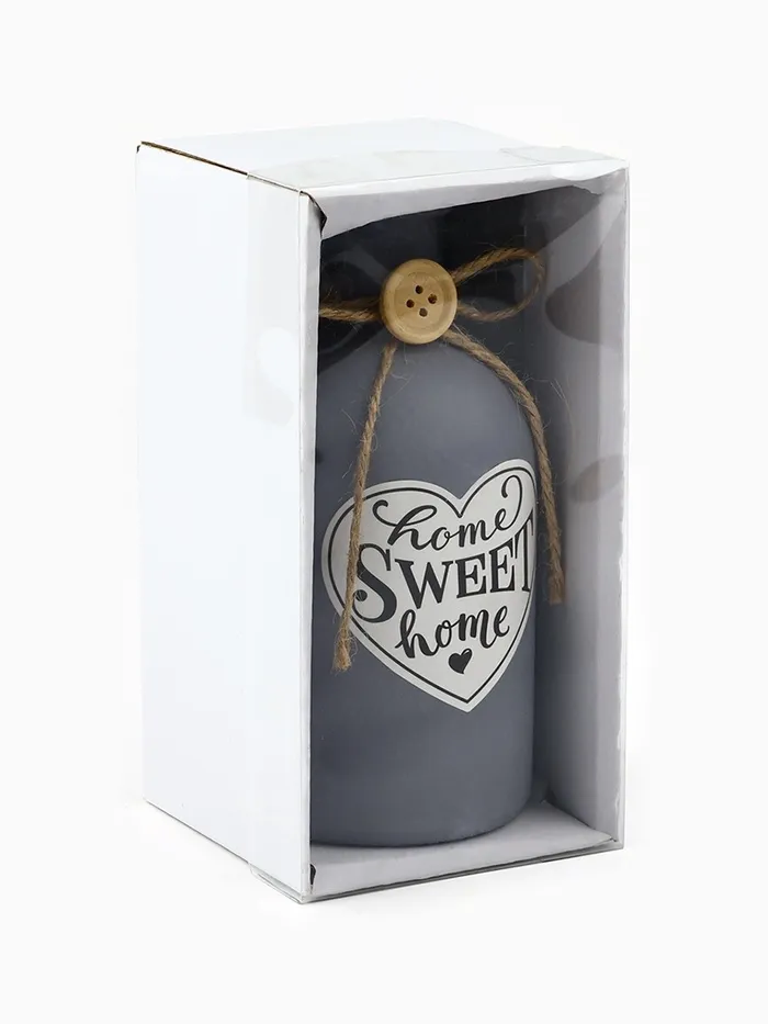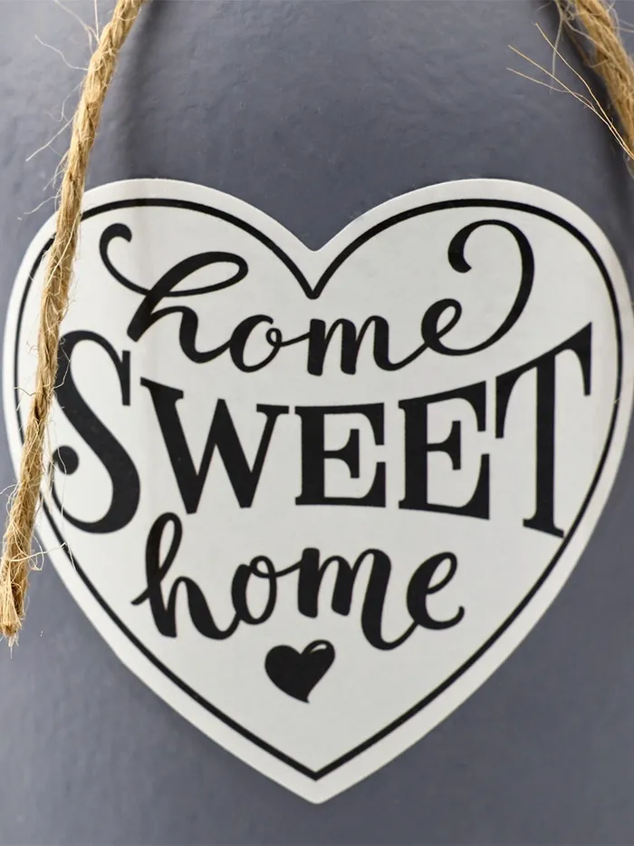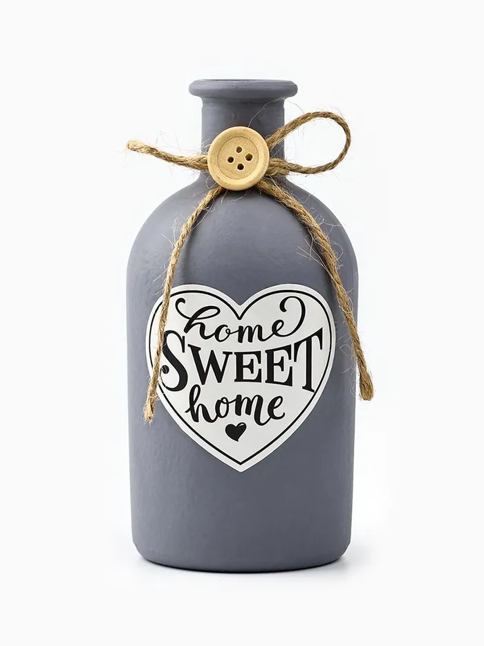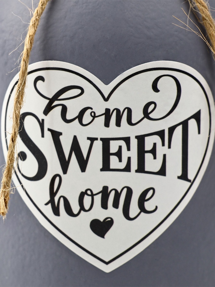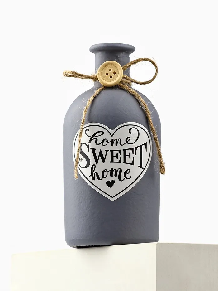 На вазе наклеена стильная надпись «Sweet home» в форме сердца.