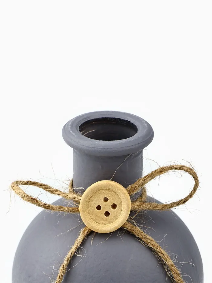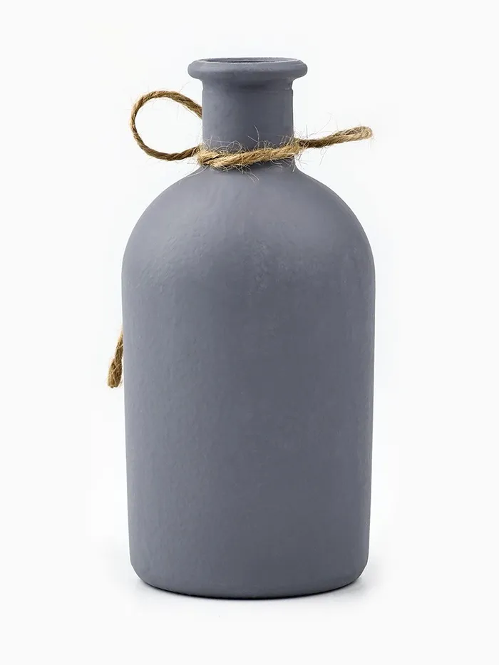 Она выполнена из стекла, имеет нежную серую окраску и украшена декоративной веревочкой с деревянной пуговицей.