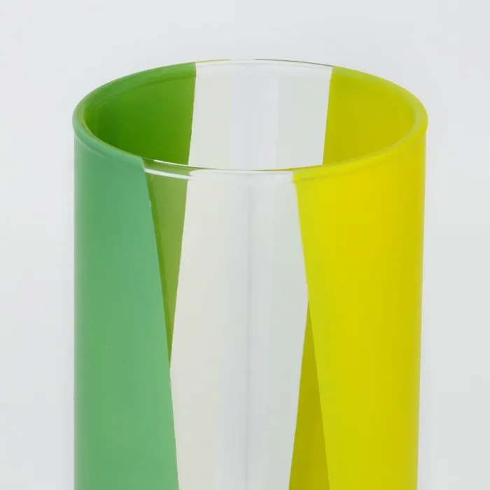 Ваза украшена диагональными полосами в двух цветах: зеленом и желтом.