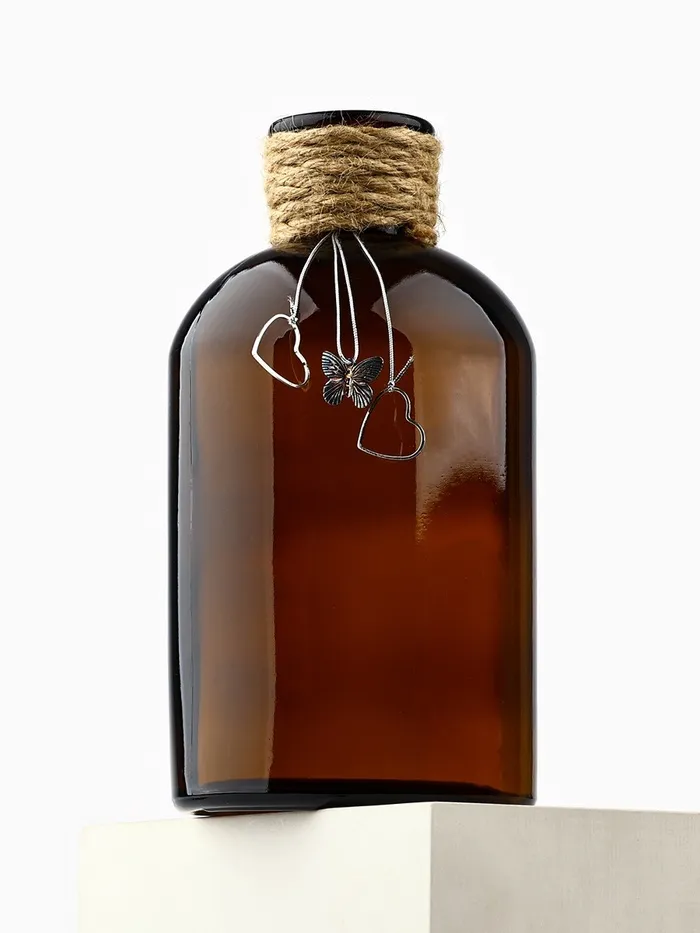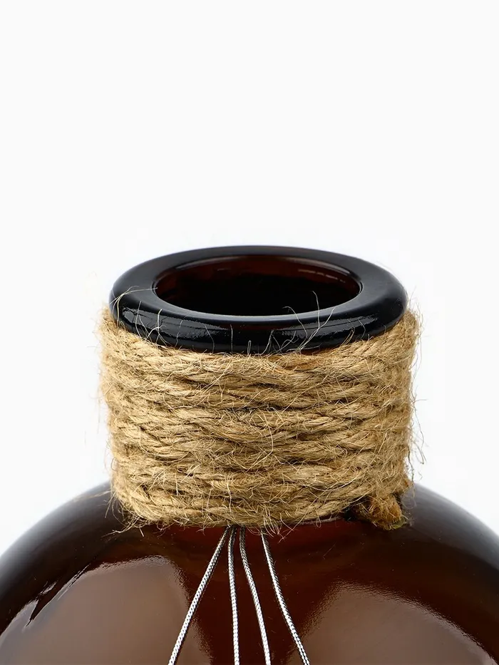 Ваза для цветов выполнена из стекла, имеет коричневый цвет и украшена декоративным элементом из джутовой веревки.