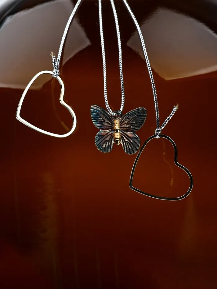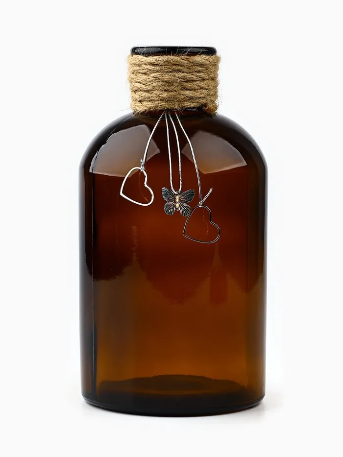 На вазе подвешены две подвески в виде сердец и бабочки.